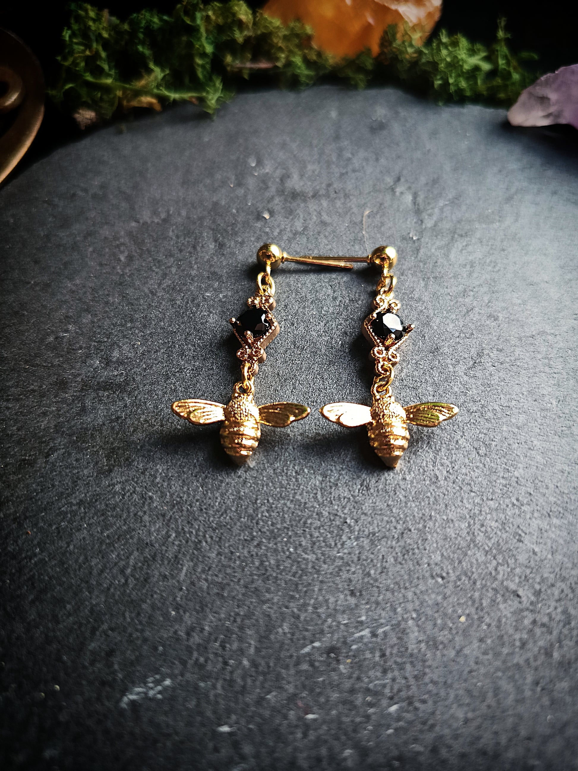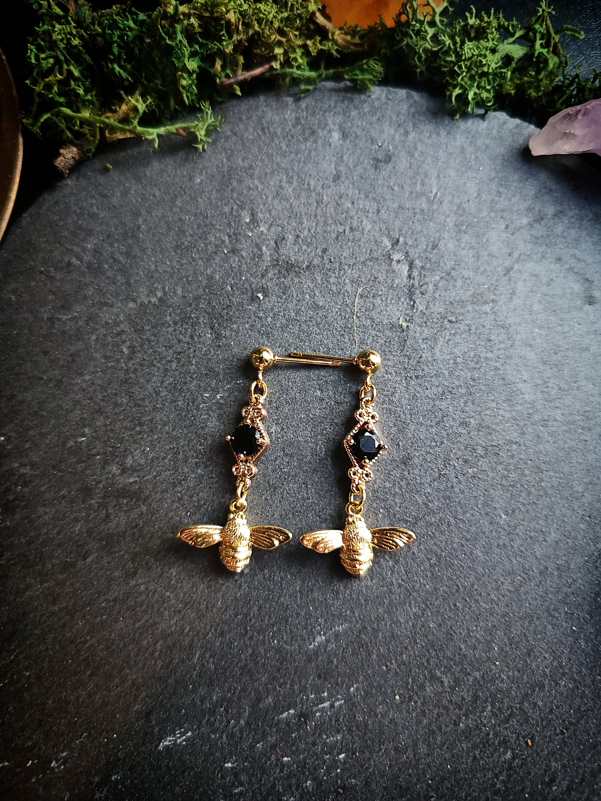 These charming little earrings feature detailed bee charms paired with dark, faceted crystals reminiscent of the classic black and yellow colors of bumblebees. Though they're small, they're full of personality, making them easy to wear while still feeling special. Ideal for lovers of insects, folklore, and subtle sparkle.