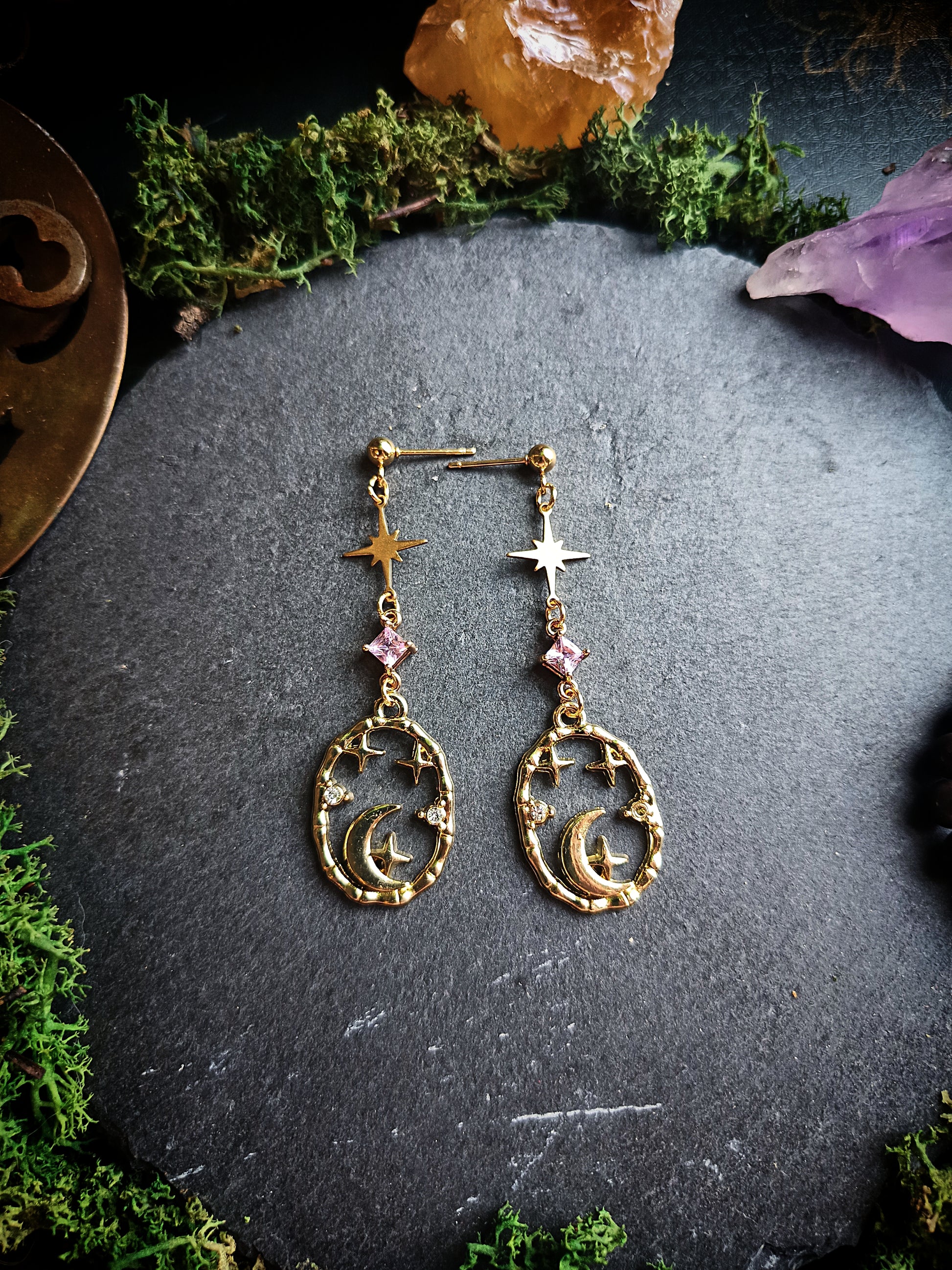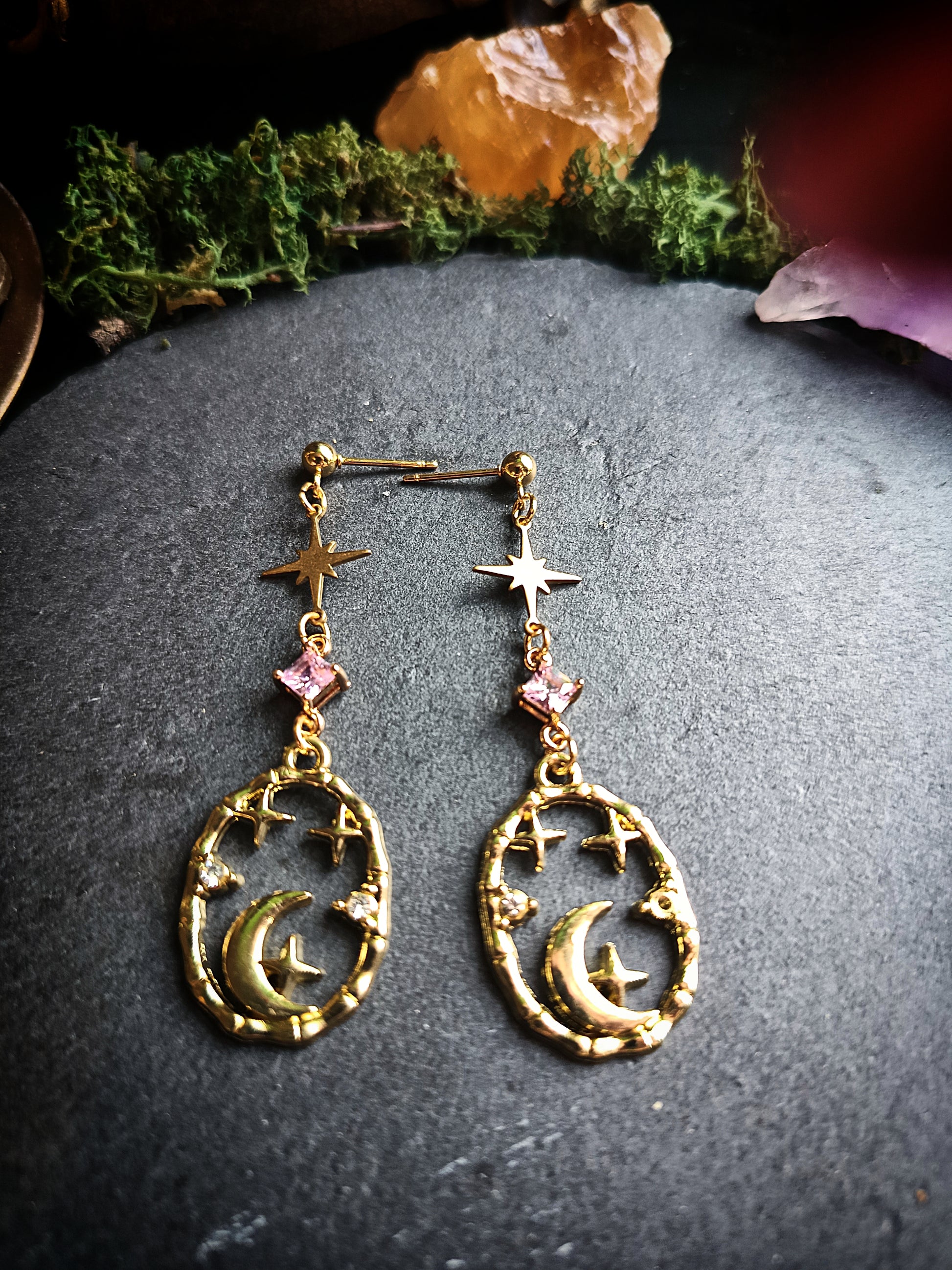 These elegant earrings feature crescent moons framed by tiny stars, dangling beneath soft pink crystals that catch the light beautifully. A lovely choice for moon lovers and stargazers alike.